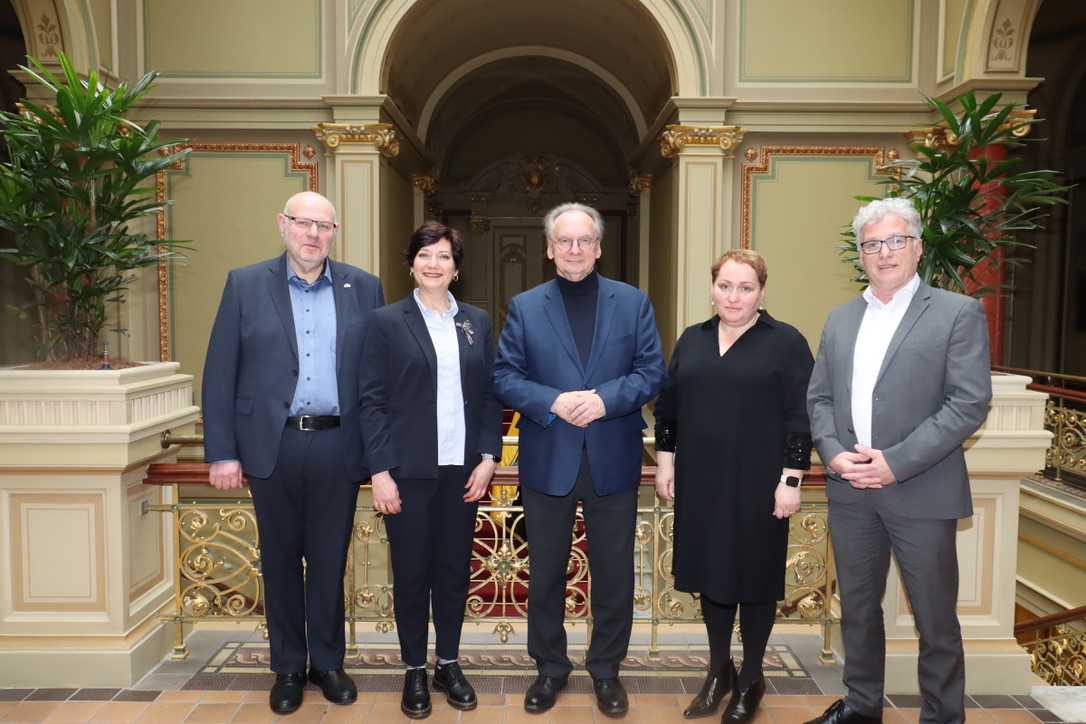 Ministerpräsident Dr. Reiner Haseloff traf sich heute mit der neuen Vorstandsvorsitzenden des Landesverbands Jüdischer Gemeinden Inessa Myslitska. Begleitet wurde sie von der neuen Geschäftsführerin des Verbandes, Rimma Fil, und ihrem Vorgänger Max Privorozki. Im Mittelpunkt des Gesprächs standen Fragen zur weiteren Entwicklung der jüdischen Gemeinden in Sachsen-Anhalt.