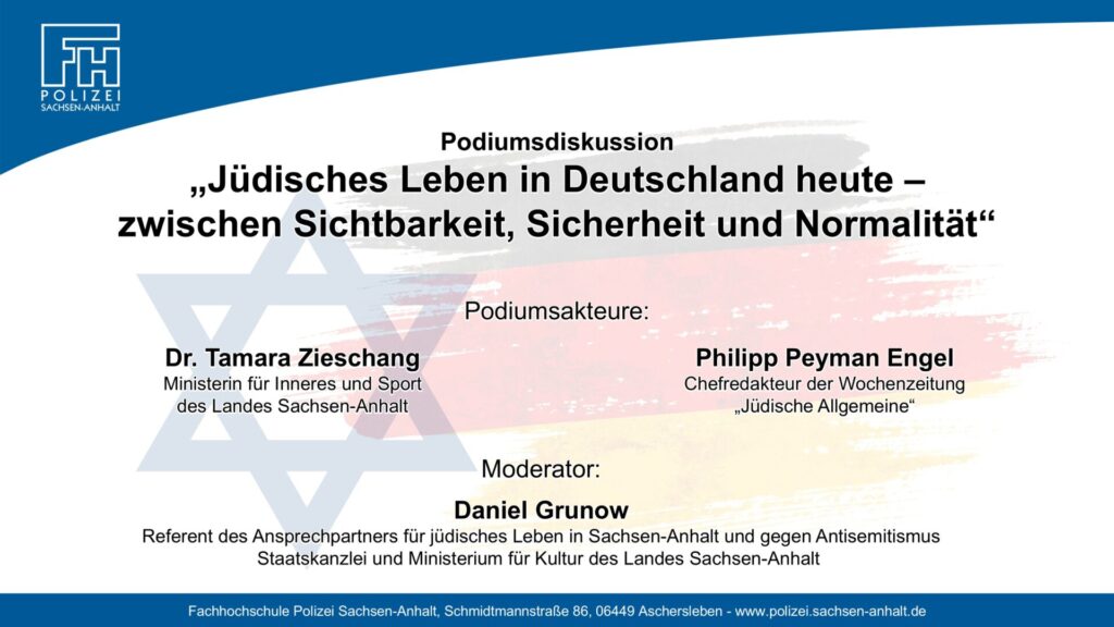 Im Rahmen einer Podiumsdiskussion an der Fachhochschule Polizei in Aschersleben diskutierte Innenministerin Dr. Tamara Zieschang gemeinsam mit dem Chefredakteur der jüdischen Allgemeinen Zeitung, Phillipp Peyman Engel, und Polizeianwärtern aus Ausbildung und Studium über die Frage, wie sich jüdisches Leben in Deutschland heute zwischen Sichtbarkeit, Sicherheit und Normalität gestaltet.